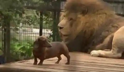 Having been abandoned by his own family, a tiny lion cub had been forwarded to the care of the park’s workers. The animal was brought to a separate enclosure far from the presence of his own family. One day the park’s workers decided to do an experiment and let two-year-old dachshunds run into his case.