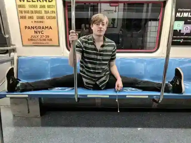 Next time the boy hops on the subway and refuses to move his legs, he should take notes from this guy!